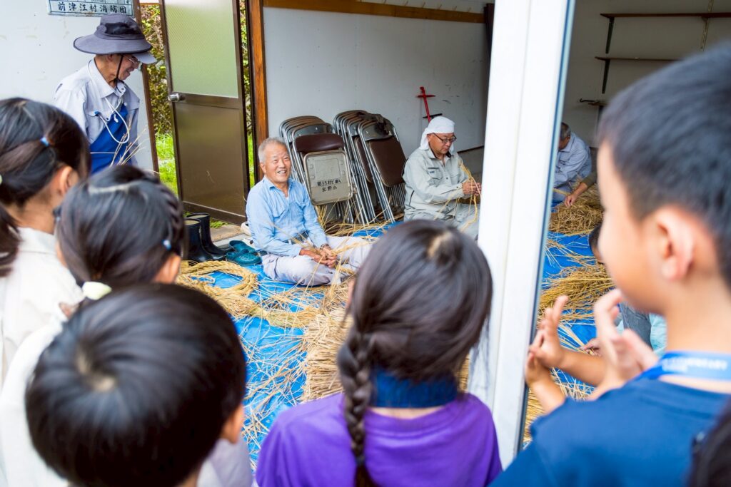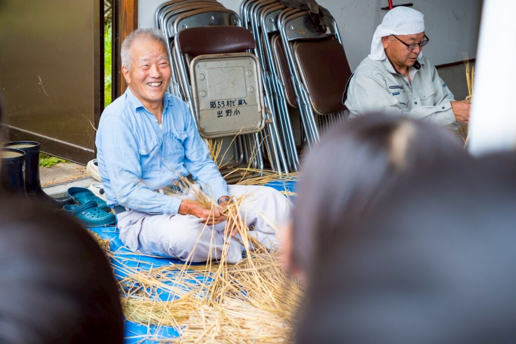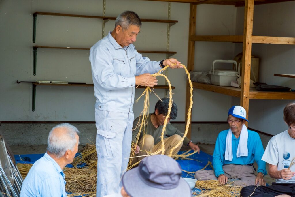 当日は、前津江町の地域のおじいちゃんたちに教えていただきながら、わらを撚ってしめ縄を作る伝統的な作業に挑戦しました。最初は慣れない手つきでしたが、優しく声をかけてもらいながら、少しずつ形にしていきました。