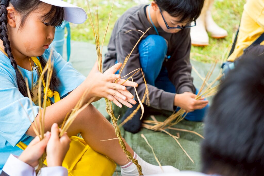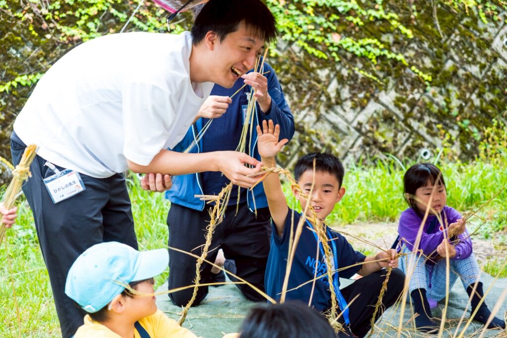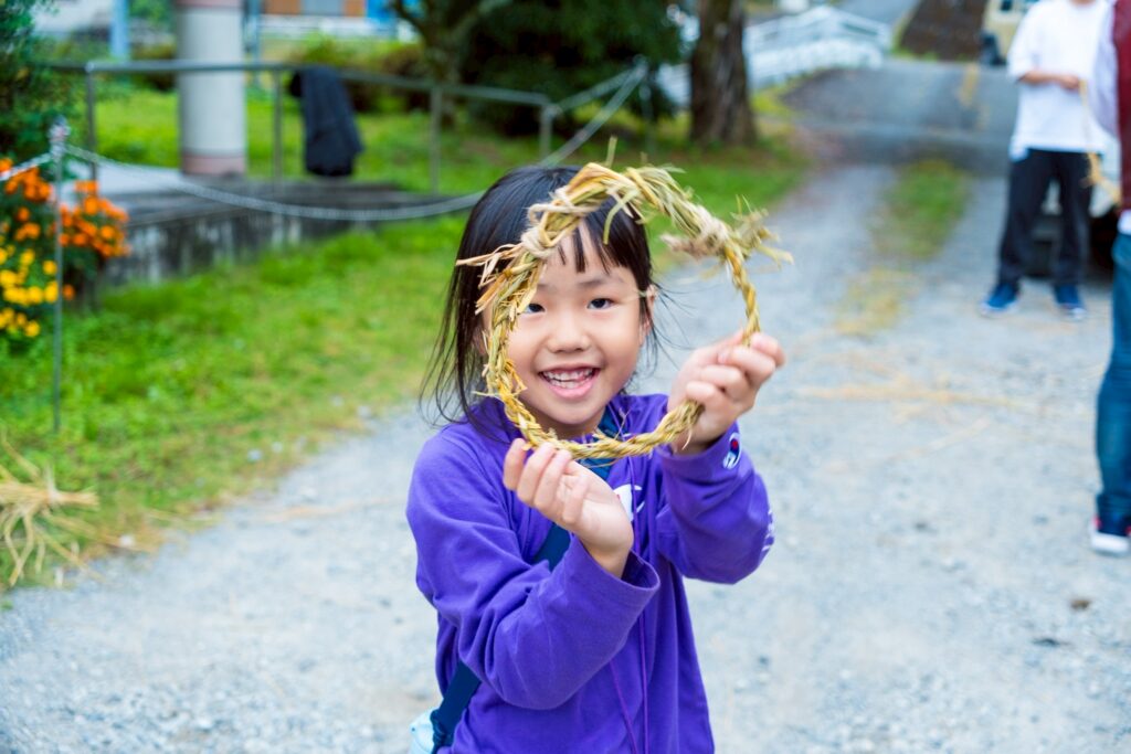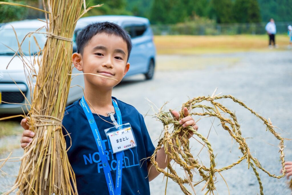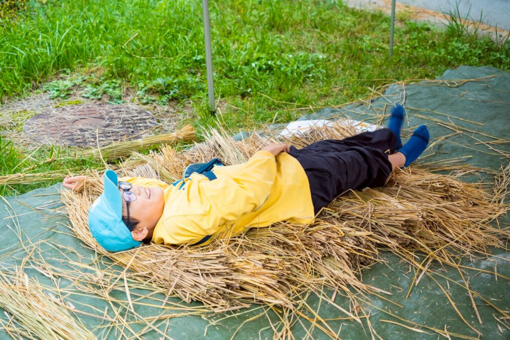 しめ縄作りそのものはもちろん、準備段階では藁の上に転がって遊ぶなど、自然の素材に触れながら思いきり楽しむ姿も見られました。都会ではなかなか体験できない、前津江町ならではの時間となりました。